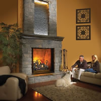 Rekindles the romantic era when sitting by the fire melted away the chills of the world outside. The traditional aesthetics provide an exceptional, unobstructed viewing area with a frameless finish. An open look of a real wood burning fireplace emerges with all the conveniences of direct vent technology. This exclusive fireplace comes fully equipped with a multi-function hand-held remote control (adjusting flame, heat, blower and exclusive Night Light™), elegant solid cast iron andirons and grate, heat circulating blower, safety pull screen and advanced burner technology. All this and the choice of either a wrought iron faceplate or a traditional arch or rectangular door design to complement your decor. |